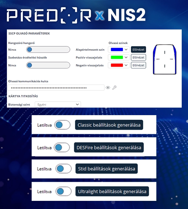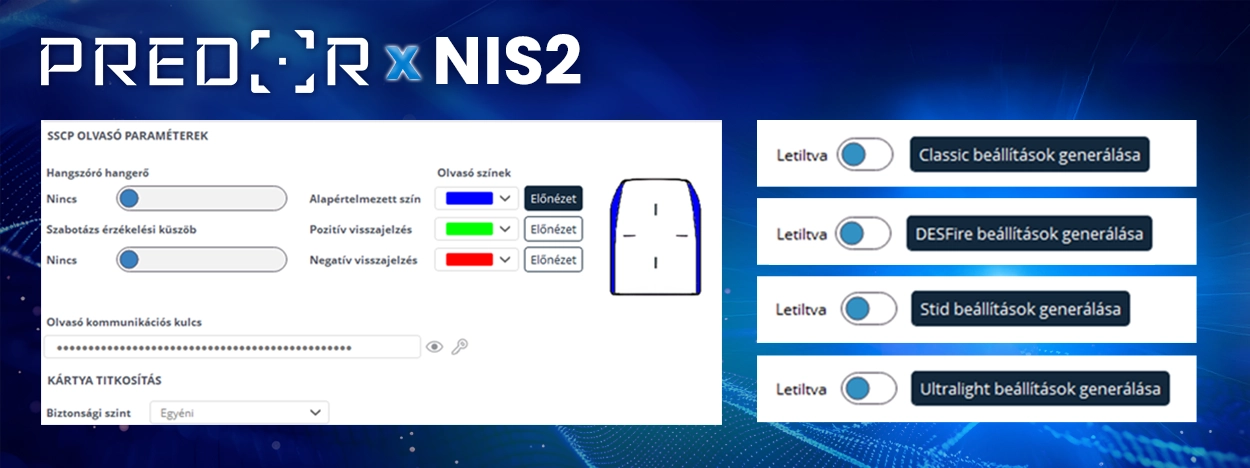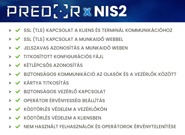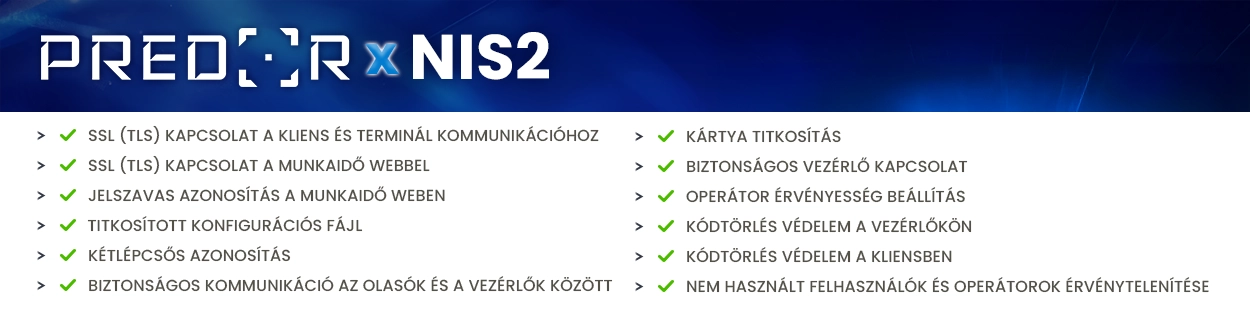 Akinek még nem ismerős a NIS2 rendelet, annak röviden: a szabályozás előírja az END-TO-END (végponttól végpontig tartó) titkosítást. Ez egy beléptetőrendszer esetében azt jelenti, hogy titkosítani kell az azonosítókat, a kártyaolvasókat, az olvasó és a vezérlő közötti adatkapcsolatot is. A kontroller és az adatbázis közti kapcsolatot és természetesen magát az adatbázist is el kellett látni megfelelő titkosítással.
