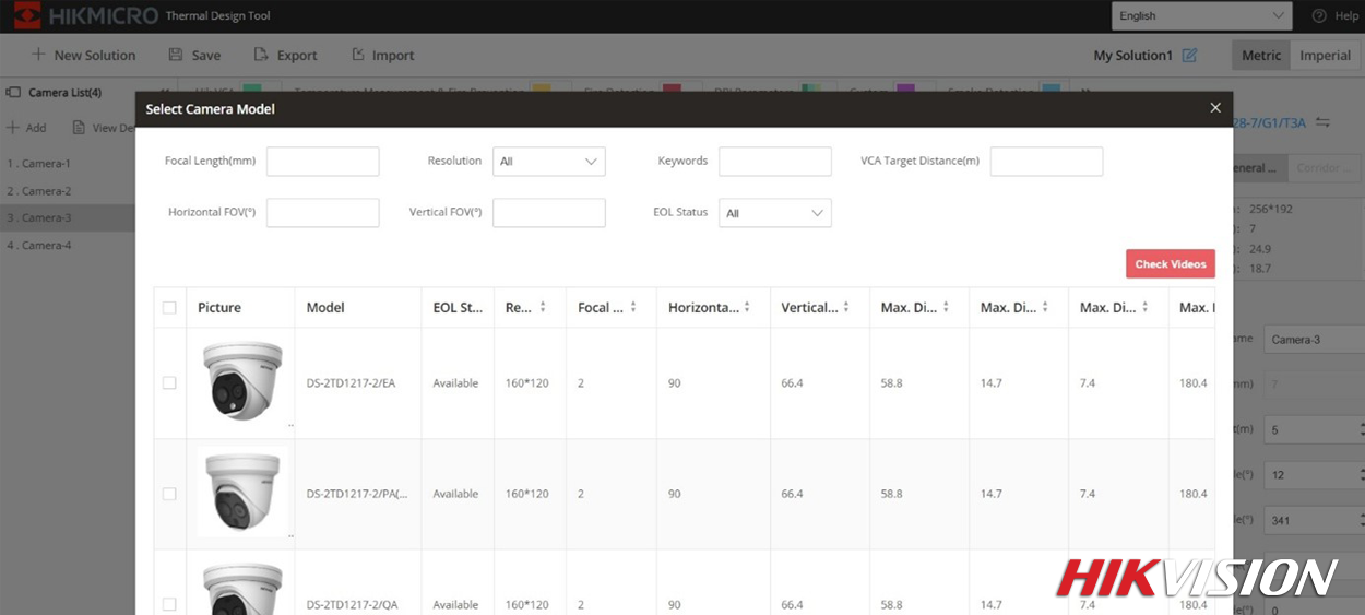 A szoftver támogatja a megfelelő hőkamera kiválasztását az adott feladathoz. A tervezés során figyelembe vehetők többek között: