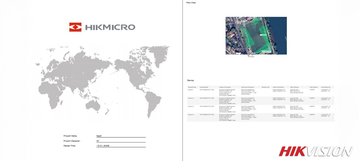 A HikMicro Tool nemcsak a tervezésben, hanem a dokumentáció elkészítésében is segítséget nyújt. A kész tervek exportálhatóak, így felhasználhatóak ajánlatokhoz, prezentációkhoz vagy belső tervezési anyagokhoz. Emellett a szoftver támogatja az eszközlista összeállítását, ami megkönnyíti az anyagkiírást és a beszerzési folyamatot is.