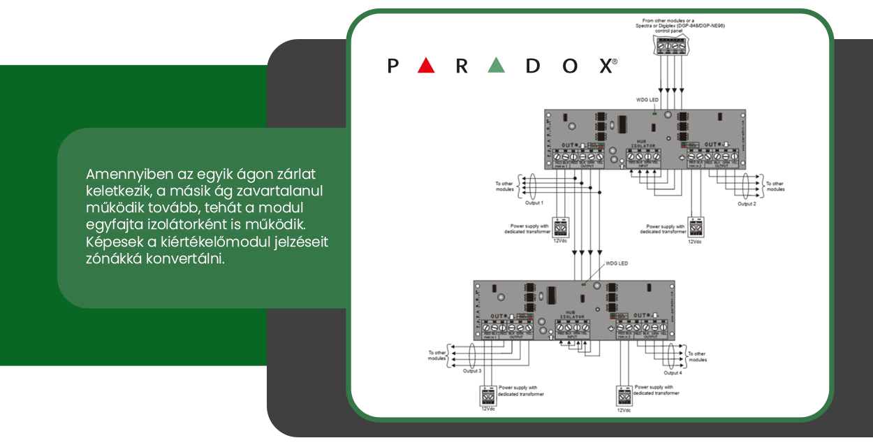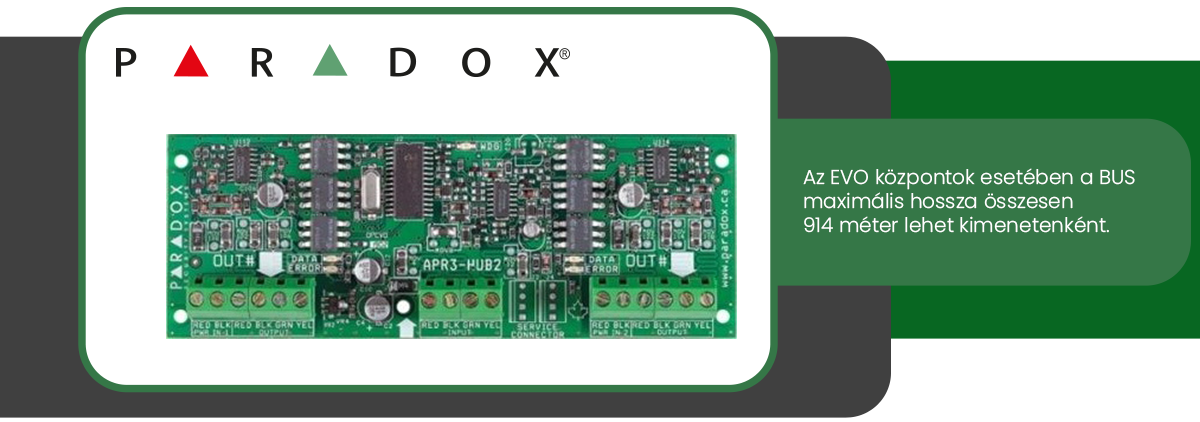 A riasztórendszerek esetében megszokott távolságokhoz képest itt sokkal hosszabb szakaszokról beszélünk. Vegyük azt az esetet, mikor a védendő objektum mérete miatt a 300/600 méteres védelem nem elég, több eszköz telepítése szükséges. Belátható, hogy ilyen esetekben a kiértékelő rendszer kontaktusait nem tudjuk közvetlenül eljuttatni a központig, ha a távolság több száz, vagy több ezer méter. Erre kínálnak megoldást a Paradox EVO központjai és BUS elosztó és toldó modulja, a HUB2.