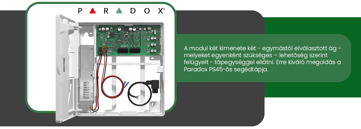 De miért is kell nekünk az adat BUS-t eljuttatnunk a kerítésvédelem távoli pontjaira is? Mert erre a BUS-ra csatlakoztathatunk bővítőmodulokat, melyek már képesek a kiértékelőmodul jelzéseit zónákká konvertálni. A modul két kimenete két - egymástól elválasztott ág - melyeket egyenként szükséges – lehetőség szerint felügyelt - tápegységgel ellátni. Erre kiváló megoldás a Paradox PS45-ös segédtápja, mely 15 voltos kapocsfeszültsége révén különösen alkalmas a feszültségesésből adódó veszteségek kompenzálására.