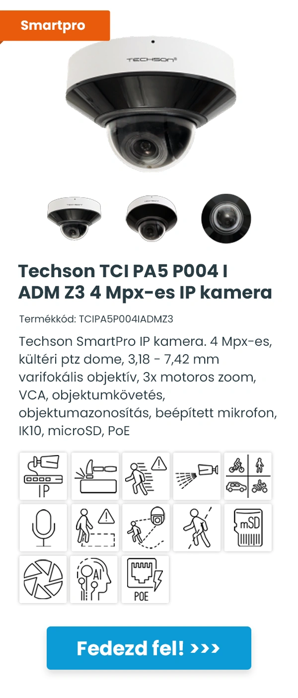 Összefoglalva, a Techson PA5 P004 egy kompakt méretű, intelligens PTZ kamera, amely diszkrét megjelenése mellett teljes értékű funkciókat kínál – mindezt meglepően elérhető áron.