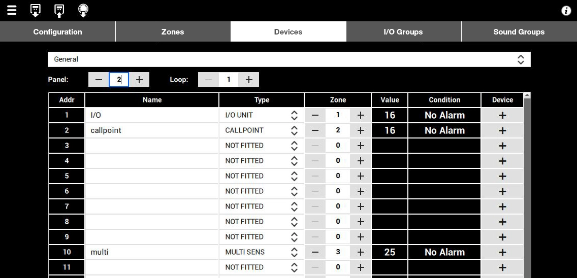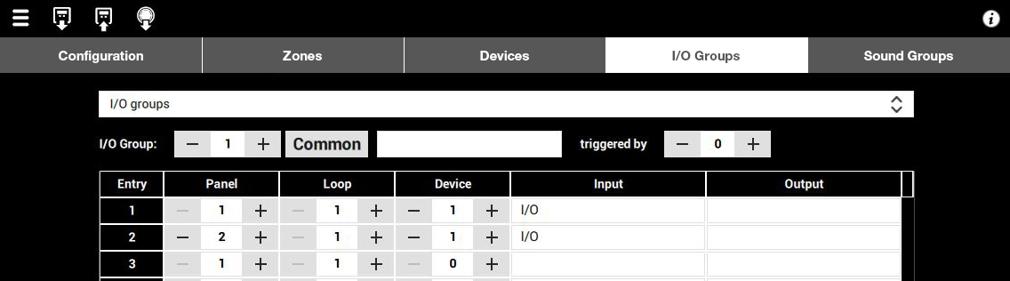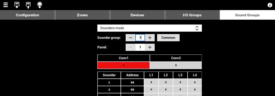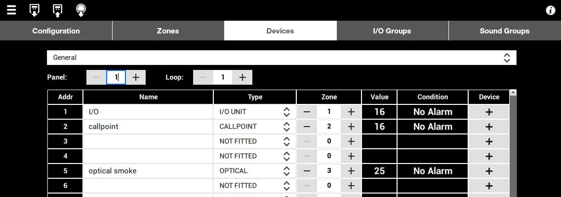 As a global system, all panels share a "cause and effect" configuration. Each time an event occurs on a panel, the panel transmits it across the network and records it in its local "event log", and then executes the cause and effect relationship (control and triggering of beeps) defined for that event.