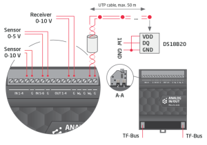 A Grenton analóg I/O modul lehetővé teszi, hogy az automatizálásban népszerű 0-10V, 0-5V és 1-wire kommunikációs szabványokat is használhassuk. Ezekkel az analóg be- és kimenetekkel különböző eszközökek és érzékelőket integrálhatunk az okosotthonunkba pl. hőmérők, páratartalom-érzékelők, szélsebesség-mérők, fényérzékelők, radiátorszelepek.