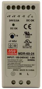 DIN-sínre szerelhető tápegység, amelyet ipari vezérlőszekrények és automatizálási rendszerek tápellátásához terveztek. A készülék 85–264 V AC vagy 120–370 V DC bemeneti feszültségtartományban működik, és 24 V DC kimeneti feszültséget biztosít 2,5 A áramerősség mellett, ami 60 W teljesítménynek felel meg. A tápegység természetes légáramlással hűtött, így csendes és karbantartásmentes működést garantál, miközben hatásfoka eléri a 87%-ot.