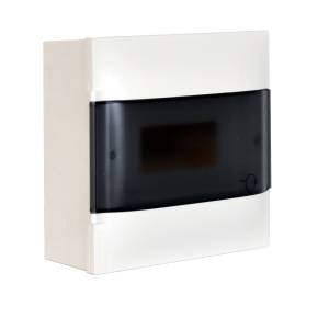 Könnyen felszerelhető, falon kívüli elosztódoboz, amely 1 sorban 8 modul elhelyezésére alkalmas. Átlátszó, füstszínű ajtaja egyszerű hozzáférést biztosít a belső elemekhez. A doboz 650°C-ig önkioltó, és IK07-es ütésállósággal rendelkezik. Tartalmaz védőföld és nulla elosztókapcsot, valamint DIN sínt a rögzítéshez.