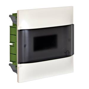 Könnyen beépíthető téglafalba süllyeszthető elosztódoboz, amely 1 sorban 8 modul elhelyezésére alkalmas. Átlátszó, füstszínű ajtaja egyszerű hozzáférést biztosít a belső elemekhez. A doboz 650°C-ig önkioltó, és IK07-es ütésállósággal rendelkezik. Tartalmaz védőföld és nulla elosztókapcsot, valamint DIN sínt a rögzítéshez.