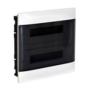 Könnyen beépíthető téglafalba süllyeszthető elosztódoboz, amely 2 sorban 12 modul elhelyezésére alkalmas. Átlátszó, füstszínű ajtaja egyszerű hozzáférést biztosít a belső elemekhez. A doboz 650°C-ig önkioltó, és IK07-es ütésállósággal rendelkezik. Tartalmaz védőföld és nulla elosztókapcsot, valamint DIN sínt a rögzítéshez.