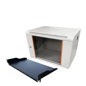 Techson 540 x 400 mély 6U magas, fali, egyrészes, összeszerelt, 19"-os rackszekrény, 250 mm mély, elöl rögzíthető polccal. Zárható üvegajtóval és levehető oldalfallal, fehér