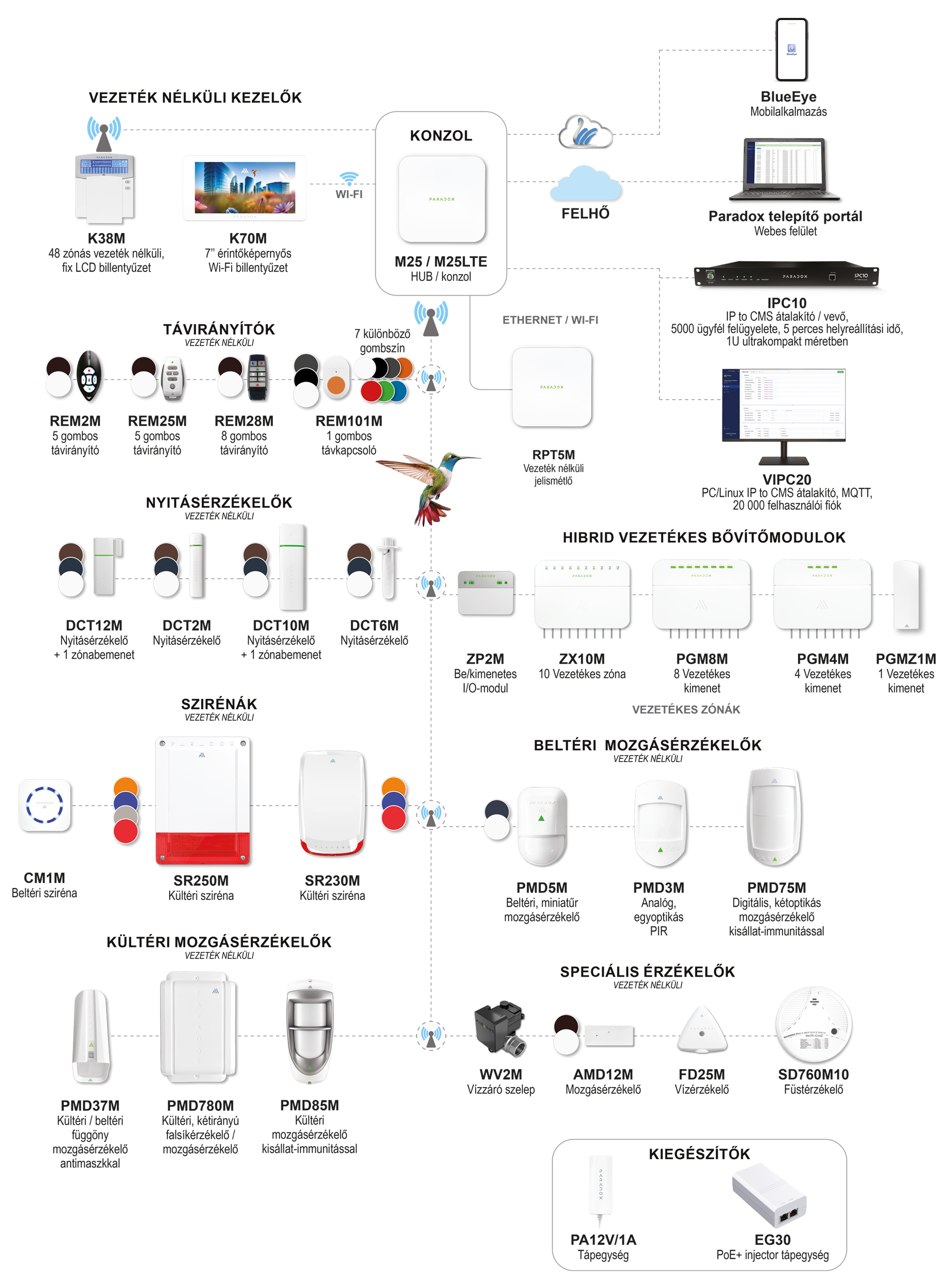 Az M25 – a Paradox új, M-sorozatú központcsaládjának tagja – egy sokoldalú és nagy teljesítményű, vezeték nélküli/vezetékes hibrid kompakt riasztóközpont. A vezeték nélküli modul a 868 MHz-es és a 914 MHz-es sávban GFSK (Gaussian Frequency Shift Keying) technológiát használ. Dinamikusan változó frekvenciát és titkosítást alkalmaz, mely megakadályozza az illetéktelen hozzáférést, miközben ultragyors kapcsolatot biztosít.
