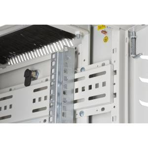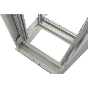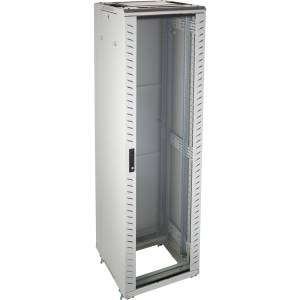 Álló rackszekrény ami ideális megoldást nyújt adatközpontok, hálózati rendszerek és IT-infrastruktúrák számára. Ez a modell lapraszerelt kivitelben érkezik. Az elülső ajtó edzett üvegből, míg a hátsó ajtó acélból készül, mindkettő egypontos zárszerkezettel és kulccsal ellátott. A szekrény oldallapjai leszerelhetők, a tető perforált, a kábelek bevezetése pedig a tetőn és az alján elhelyezett kefés nyílásokon keresztül történhet. A belső térben 19"-os profilsínek találhatók, a magasság pozíciói U-számozással vannak jelölve, a profilsínek mélységben állíthatók. Földelőkészlettel ellátva. A szállítási csomag részét képezik az állítható lábak és a zárható görgők is. Súlya 73 kg. RAL9002