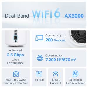 1148 Mbps a maximális sebesség a 2.4 GHz - es sávban, 4804 Mbps a maximális sebesség az 5 GHz -es sávban, 2 db gigabit LAN portot tartalmazAX6000 Dual-Band Wi-Fi - 4804 Mbps (5 GHz) + 1148 Mbps (2,4 GHz).