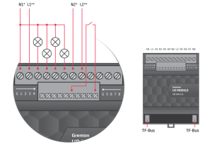 A Grenton 8 csatornás I/O moduljával akár 2 x 4 db egymástól független kisebb fogyasztású (max. 230 VAC, 1,6 A) eszközt tudunk be- és kikapcsolni (pl. lámpák, szelepek, kapuk, rekuperátor). Ezenkívül lehetővé teszi 8 db független, kontaktuskimenetet használó eszköz csatlakoztatását is a rendszerhez (pl. klasszikus kapcsolók, mozgás-, füst- vagy vízérzékelők).