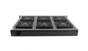 1 U magas ventilátor-egység, amelyet kifejezetten hálózati és szerver-szekrények aktív hűtésére terveztek. A készülék 6 db ventilátort tartalmaz, amelyek hatékonyan segítik a levegő áramlását a szekrényen belül, csökkentve az ott elhelyezett eszközök hőterhelését. Az egység fekete színű acélházban készül, és 230 V AC, 50 Hz hálózati feszültségről működik. Teljesítményfelvétele 88 W, ami a hat ventilátor együttes működéséhez elegendő. A panel előlapján neon kapcsoló található, így a működés könnyen ellenőrizhető.