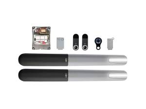 24Vdc szárnyaskapu szett burkolat világítással, max 4m-es 300kg-os kapuszárnyig - PRÉMIUM KATEGÓRIA; a 2 darab elegáns és formatervezett motor beépített nyitási mechanikai ütközővel van ellátva és lehetőség van a SUB távirányítóval történő kuplungkioldásra. Az NLS (Éjszakai Fényrendszer) tagja, aminek köszönhetően a kaput párhuzamosan lehet távirányítóval vagy okostelefonos App-on keresztül is irányítani bluetoothos interfész segítségével. Ehhez szükség van a 14A vezérlésre és a felhasználói KUBE, a távoli programozáshoz pedig a KUBE PRO okos eszközre.