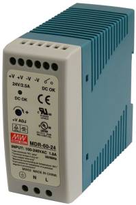 DIN-sínre szerelhető tápegység, amelyet ipari vezérlőszekrények és automatizálási rendszerek tápellátásához terveztek. A készülék 85–264 V AC vagy 120–370 V DC bemeneti feszültségtartományban működik, és 24 V DC kimeneti feszültséget biztosít 2,5 A áramerősség mellett, ami 60 W teljesítménynek felel meg. A tápegység természetes légáramlással hűtött, így csendes és karbantartásmentes működést garantál, miközben hatásfoka eléri a 87%-ot.