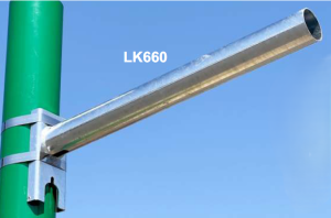 Tűzihorganyzott acél lámpakar, amely kör keresztmetszetű oszlopokra szerelhető kültéri lámpatestek rögzítésére. A 60 mm átmérőjű, 600 mm hosszú kar szalagos rögzítéssel szerelhető, és kb. 5°-os dőlésszöge segíti a megfelelő világítási irány beállítását. Tartós, korrózióálló kialakítása miatt közvilágítási és területvilágítási alkalmazásokhoz ideális.