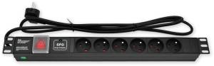 19"-es, 1U magas rackbe szerelhető tápegység panel (PDU), fekete kivitelben, amely elsősorban szerver- és hálózati szekrények áramellátására szolgál. Hat darab 230 V-os aljzattal rendelkezik, és a beépített túlfeszültség-védelem mellett ki-/bekapcsolóval is fel van szerelve. A hozzá tartozó tápkábel hossza 140 cm.