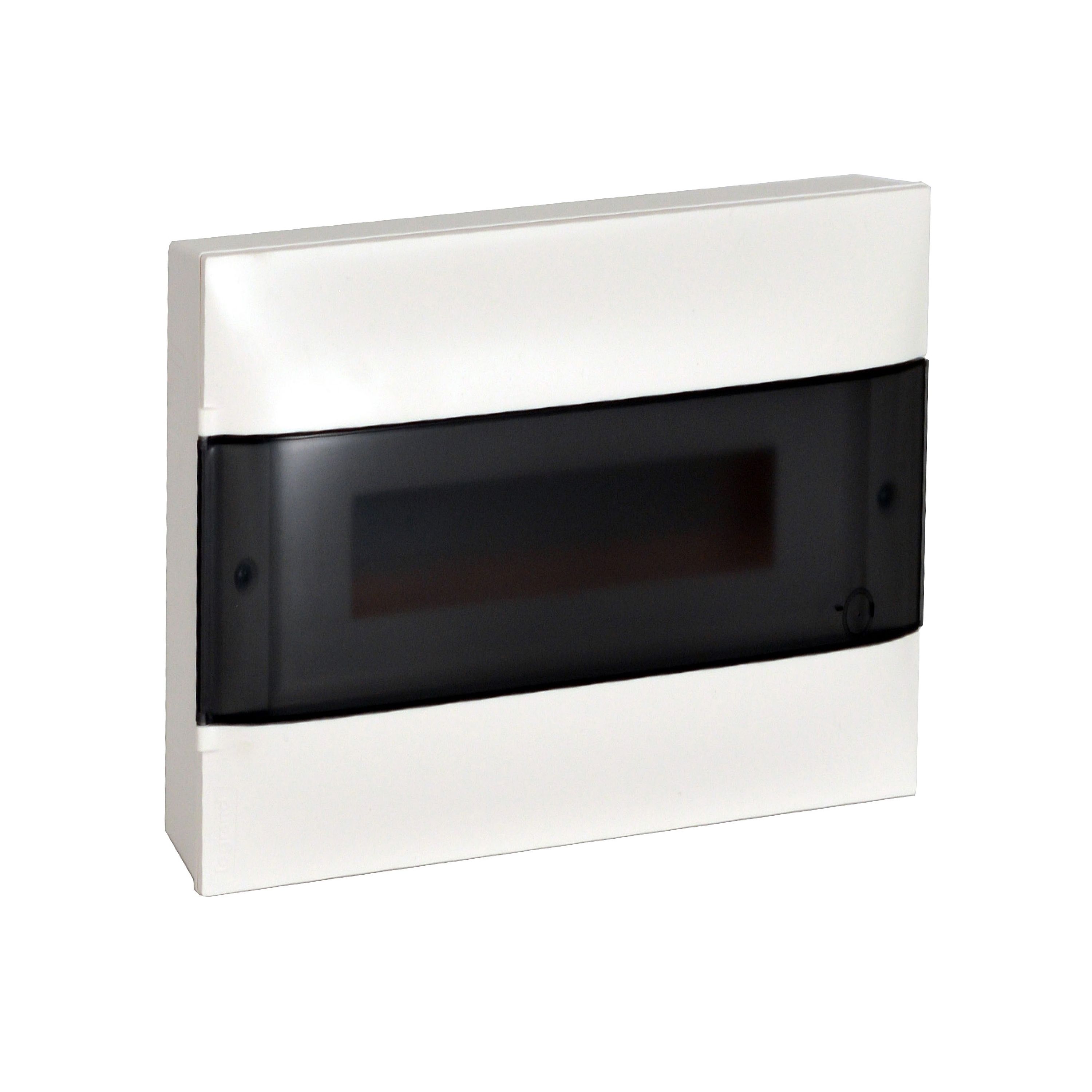 Könnyen felszerelhető, falon kívüli elosztódoboz, amely 1 sorban 12 modul elhelyezésére alkalmas. Átlátszó, füstszínű ajtaja egyszerű hozzáférést biztosít a belső elemekhez. A doboz 650°C-ig önkioltó, és IK07-es ütésállósággal rendelkezik. Tartalmaz védőföld és nulla elosztókapcsot, valamint DIN sínt a rögzítéshez.