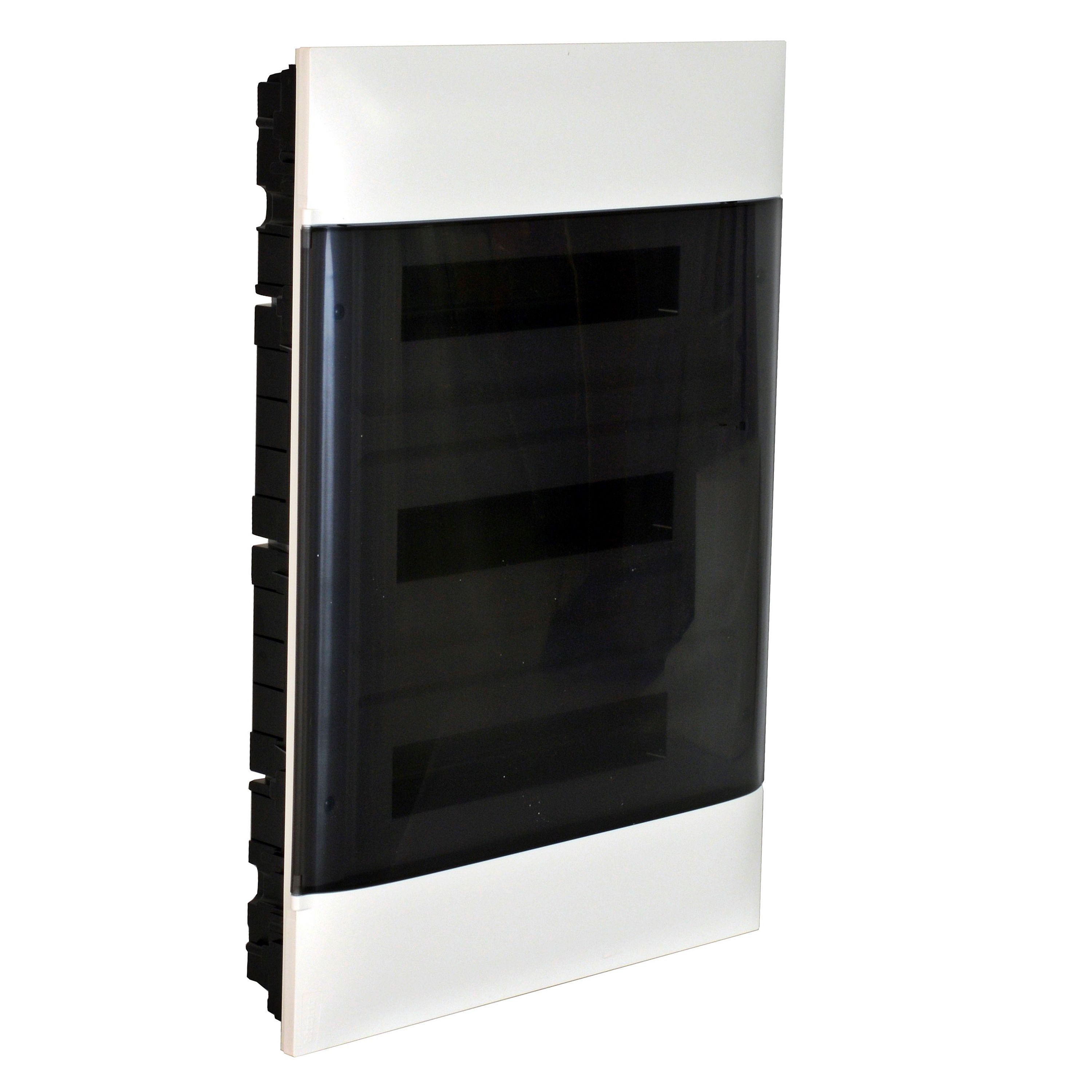 Könnyen beépíthető téglafalba süllyeszthető elosztódoboz, amely 3 sorban 18 modul elhelyezésére alkalmas. Átlátszó, füstszínű ajtaja egyszerű hozzáférést biztosít a belső elemekhez. A doboz 650°C-ig önkioltó, és IK07-es ütésállósággal rendelkezik. Tartalmaz védőföld és nulla elosztókapcsot, valamint DIN sínt a rögzítéshez.