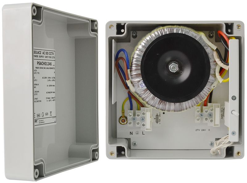 Pulsar PSACH 1x6A/24V AC dobozolt táp, az eszköz típusa: toroid transzformátor, a kimeneti feszültség: 24V, a kimeneti teljesítmény: 24VA/W, mechanikai kivitel szerint: dobozolt, a névleges bemeneti feszültség: 230V, túlterhelés elleni védelem: 6,3A biztosíték, az IP védettség szintje: IP65., Pulsar Dobozolt (IP65) kamera tápegység, rövidzár, túlterhelés és túlmelegedés védelem, Bem: 230VAC Kim: 6A/24V AC VAGY 5,5 A/27V AC