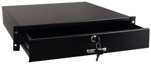 2U magas fiók 19″ rackszekrényekhez, amely ideális megoldást kínál különféle kiegészítők, dokumentumok vagy szerszámok biztonságos tárolására. A 360 mm mély acélfiók részlegesen kihúzható kialakítású, elöl zárható, két kulccsal szállítva. A fiók a rackszekrény frontoldalára rögzíthető, a csomag tartalmazza a szükséges szerelési elemeket (M6 csavarok és kosáranyák).