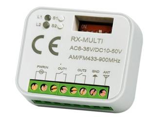 RX MULTI - 2 csatornás, univerzális rádióvevő. 300-868MHz. 9-30Vac/Vdc, folyamatos kontaktust ad, amíg a rádiójelet kapja