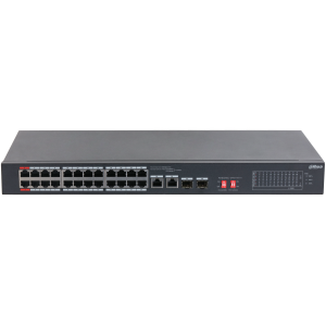Dahua PFS3226-24ET-240 2 db 10/100 Mbps Hi-PoE port, 22 db 10/100 Mbps PoE port, 2 db 10/100/1000 Mbps Combo RJ45/SFP uplink port, nem menedzselhető switch, PoE budget 240W