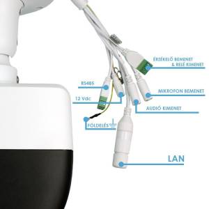 A kamera tápellátása történhet PoE rendszerű NVR, switch vagy tápfeladó segítségével is. A kamera 1 riasztásbemenetet és 1 relékimenetet kínál. Mikrofonbemenettel rendelkezik. Vonalkimenettel rendelkezik. A készüléken kártyafoglalat található az SD kártyák számára.